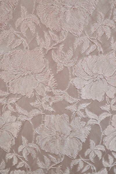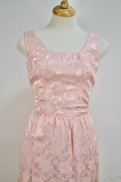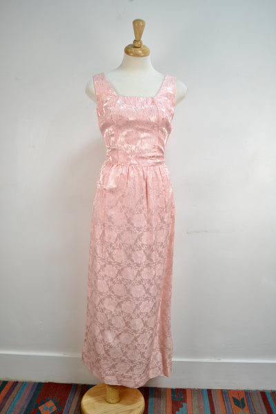 Vintage Fifties/Sixties Gorgeous Pink Floral Jacquard Maxi Dress. Metal Talon Zipper in Back With Hook & Eye Closure. Lined. Kick Slit. Tailored.