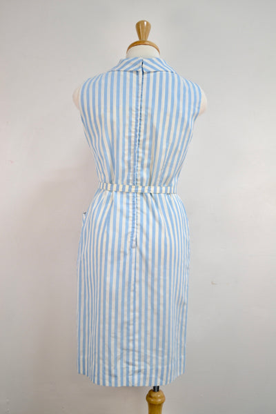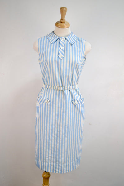 Vintage Fifties/Sixties Blue and White Striped Wiggle Dress. Chest Darts. Metal Zipper Closure in Back with Hook & Eye Closure on Collar. Two Hip Pockets. Matching Belt. Unlined.