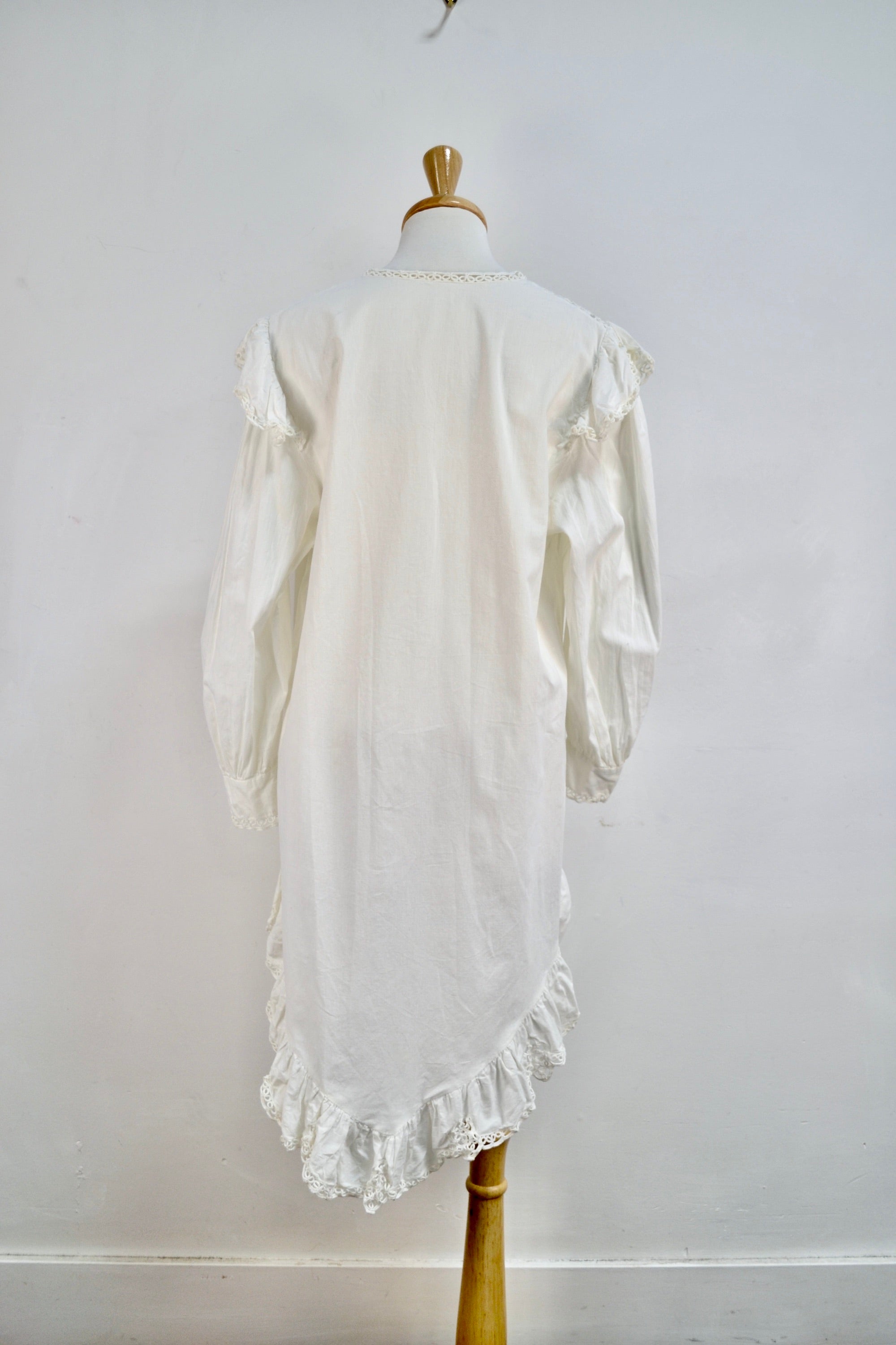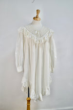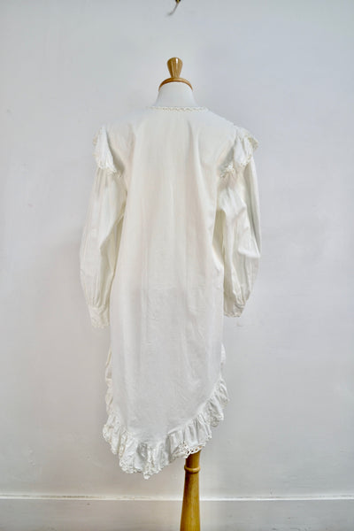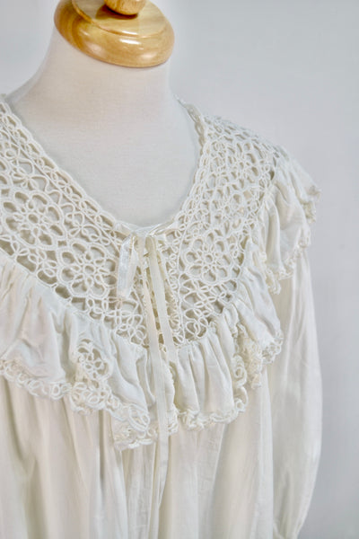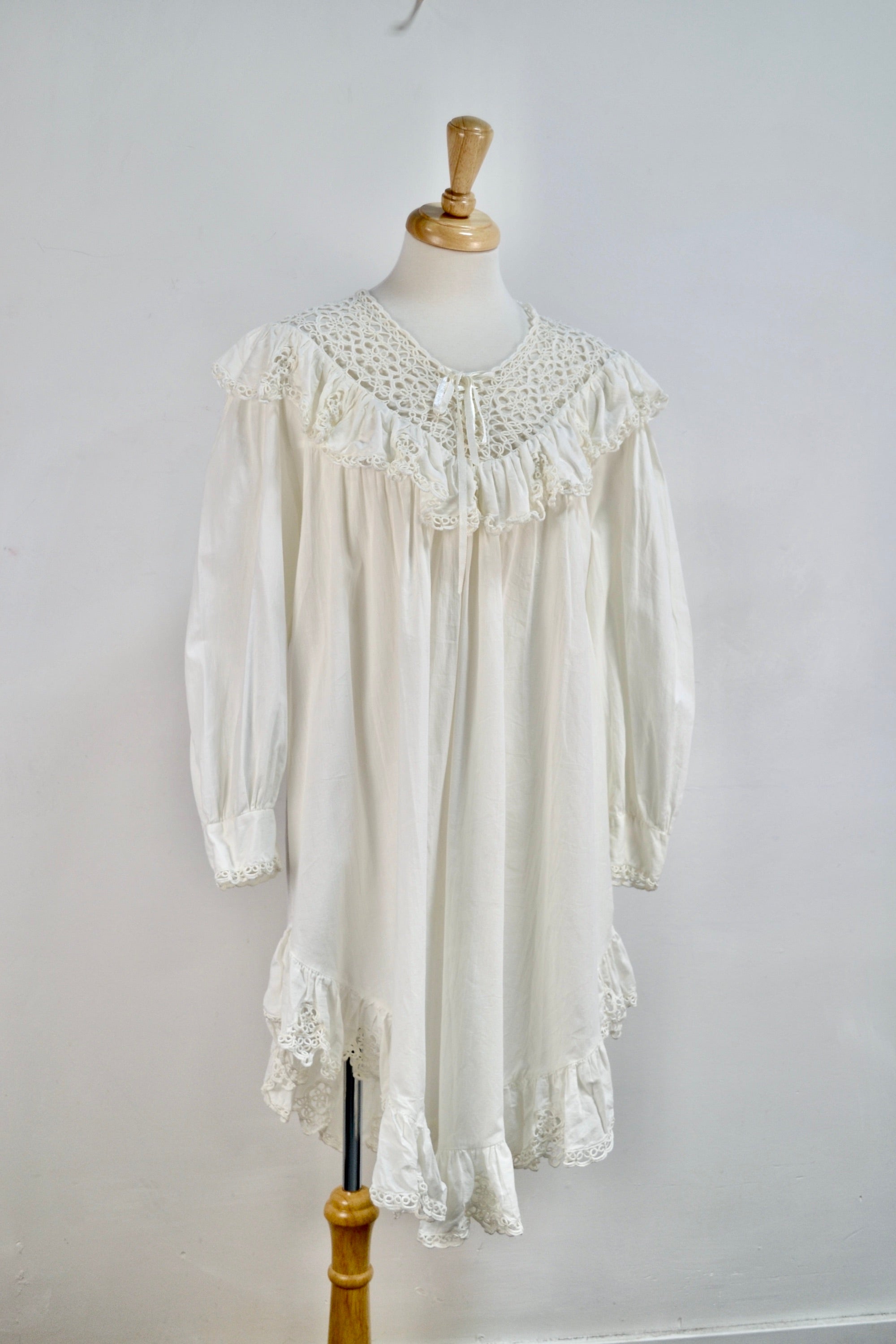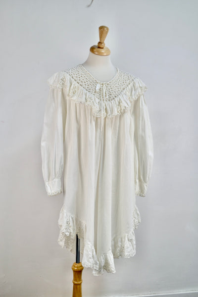 Adorable Vintage White Cotton Ruffle Nightie. Long Sleeve. Unlined. Asymmetrical Hem (higher on sides) Crochet Lace Yoke.