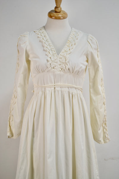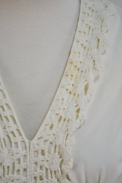 Vintage Seventies White Cotton Crochet Lace Maxi Dress. Tiered Skirt. V Neck. Unlined. Zipper Closure in Back.