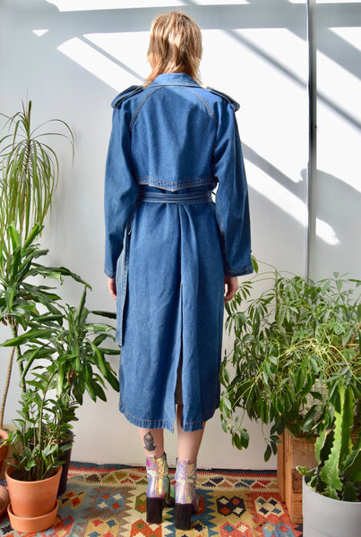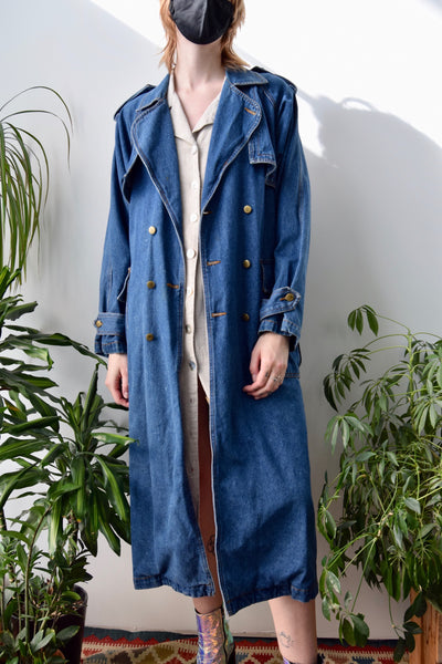 Medium Wash Denim Trench Coat. Collared. Storm Flaps.Button Closure. Belted. Two Patch Pockets. Unlined.