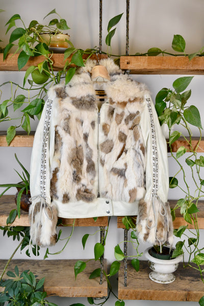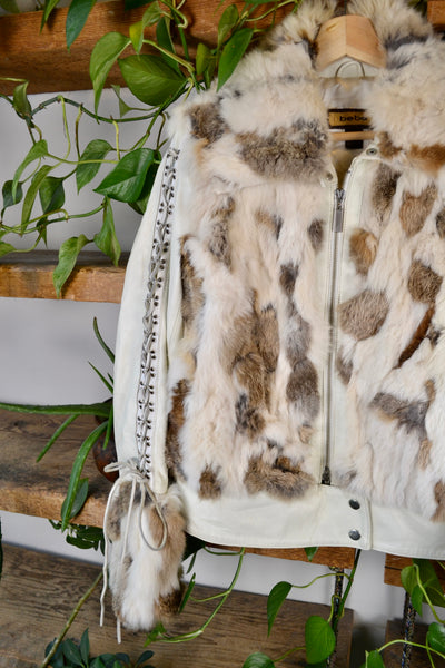 Vintage Y2K Rabbit Fur Bebe Leather Jacket. Lace Up Sleeves, wit Fur Cuffs. Lined. Zipper Closure. Oversized Fur Collar.