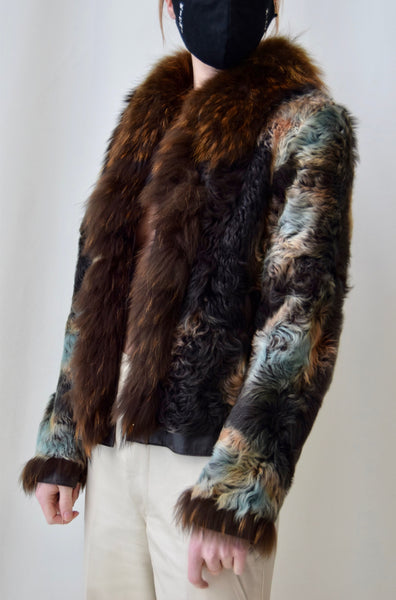 Multi Colour Short Fur Jacket With Contrast Collar, Sleeve Cuffs And Button Placket. Snap Front Closures. Two Hip Pockets.