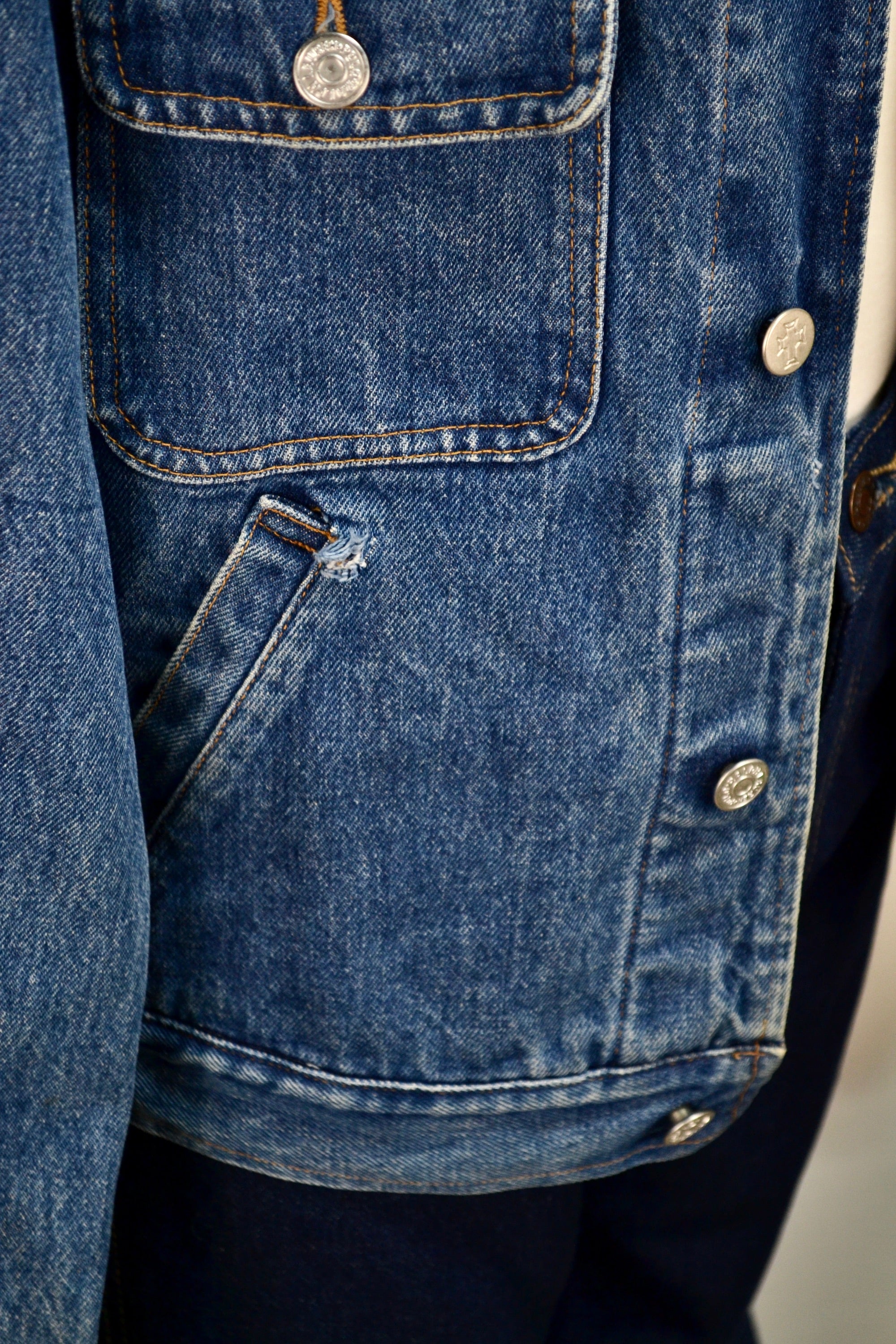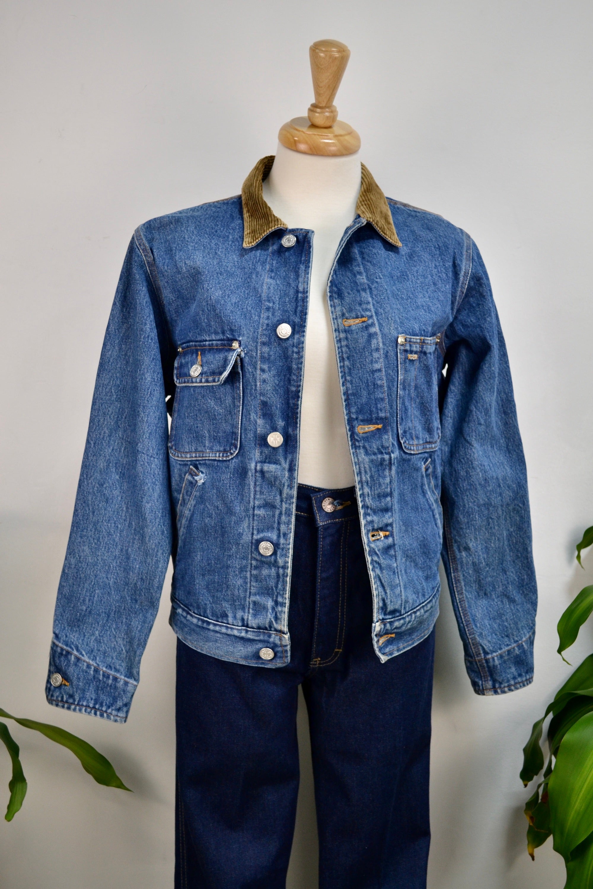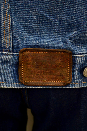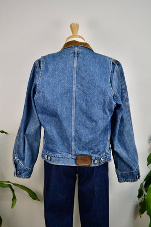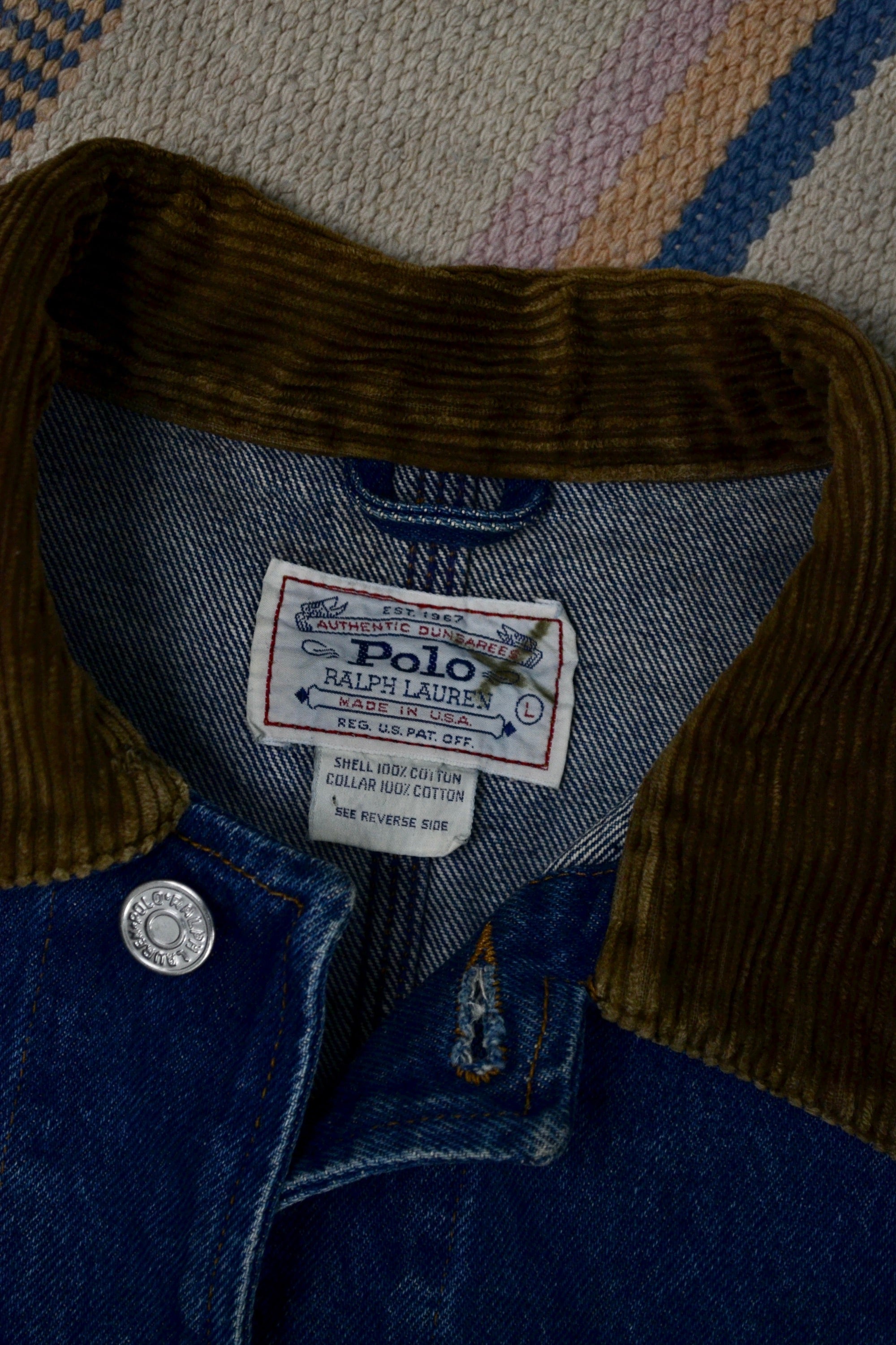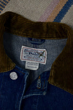 Vintage "Polo Ralph Lauren Authentic Dungarees" Mid Wash Denim Jacket. Four Pockets with Rivet Details. Button Closure in Front. Unlined. Corduroy Collar.