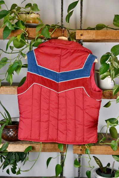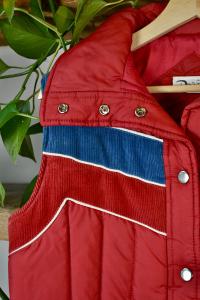 Vintage 70s/80s Red Puffer Vest With Corduroy Detailed Yoke. Snap Button Closure. Two Hip Pockets.