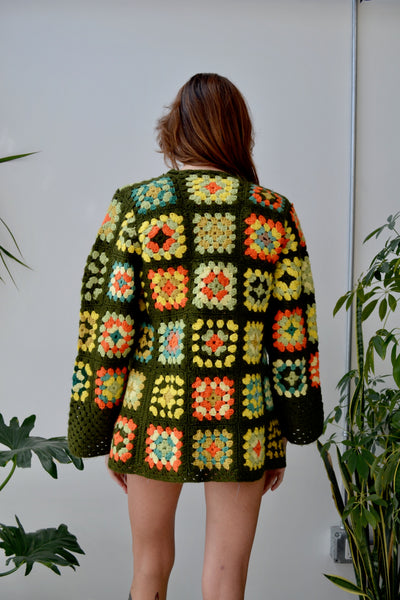 Super Cute Forest Green Granny Square Knit Cardigan/Light Jacket. Unlined. Tie Closure in Front.