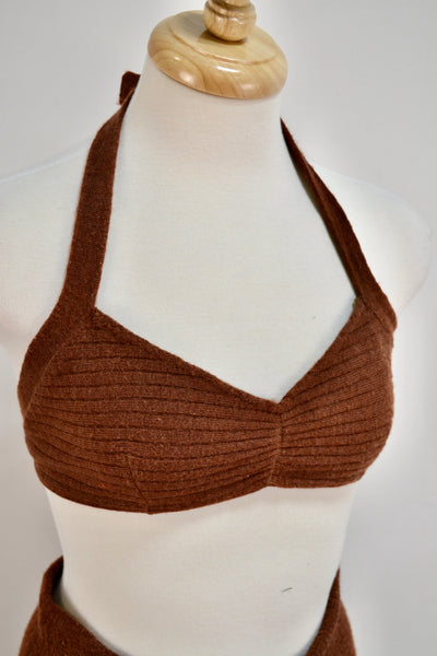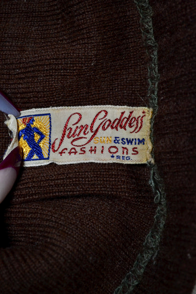 Vintage Fifties "Sun Goddess" Brown Knit Two Piece Play Suit. Unlined. Halter Top. Elastic Waist on Bottoms With Drawstring Closure.