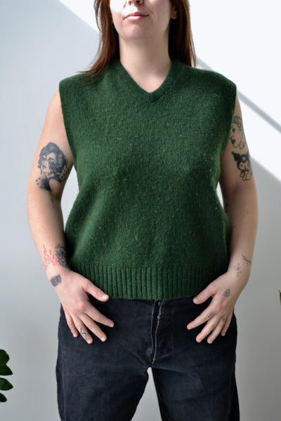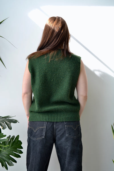 Seventies Forest Green Jantzen Wool Sweater Vest. Ribbed V Neck & Hem. Unlined.