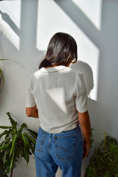 Cream Rayon/Linen Cropped Button Up Top. Classic Collar. Mother Of Pearl Buttons.
