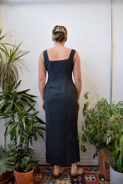 Nineties Charcoal Silk and Linen Maxi Dress. Zipper Closure Up Size. Darted Waist. Unlined.