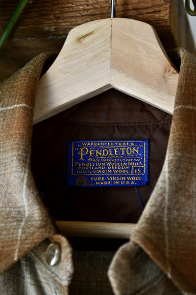 Vintage Seventies Brown Plaid Wool Pendleton Button Up Shirt. Pointed Collar. Unlined.