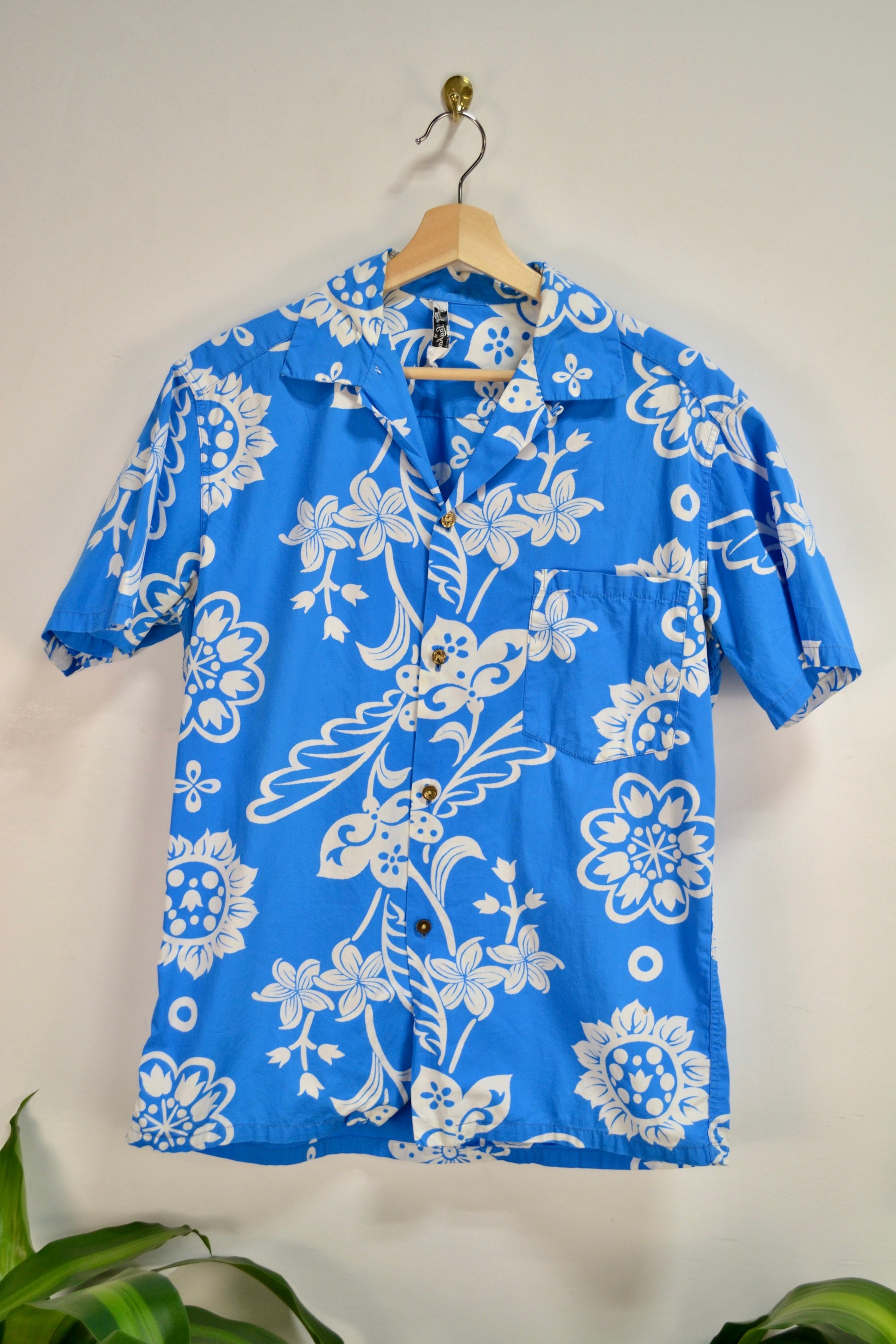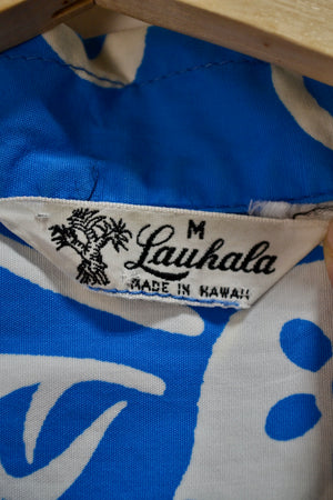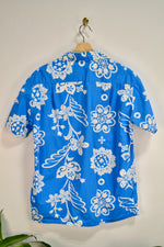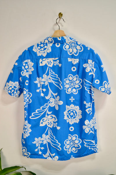 Vintage Blue & White Patterned Hawaiian Short Sleeve Button Up. Chest Pocket.