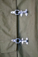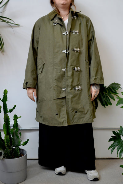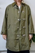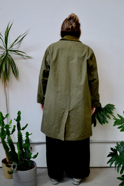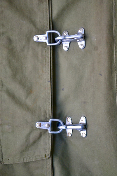 Seventies(?) Canvas Foul Weather Parka. Lined. Cord Collar. Navy Clasp Closure in Front. Two Pockets.