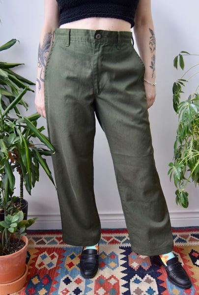 Remember When Lindsay Lohan Was In That Band Pink Slip? We Do. Dark Green Vintage Military Pants. Four Pockets. Zipper Fly. Button Waist. Goes Well With Layered Studded Belts.