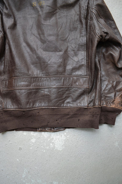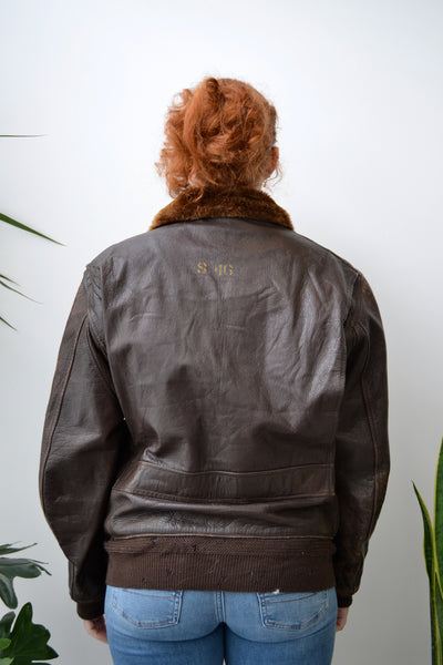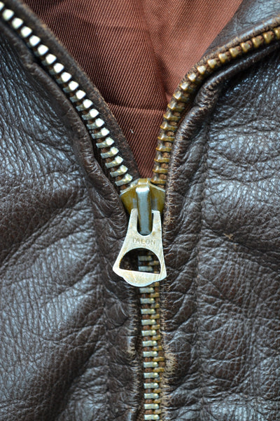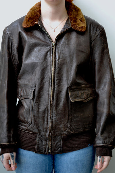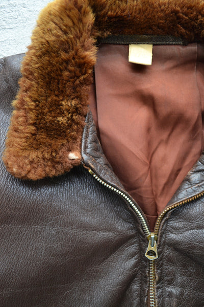 WWII USN Leather Flyer Jacket. Knit Waistband & Cuffs. Fur Trim Collar. Talon Bell Zipper Closure. Two Front Pockets With Button Closure, One Inner Pocket With Snap Button Closure. Lined.
