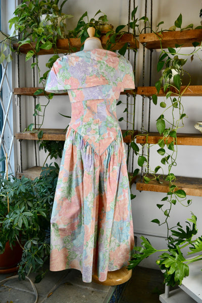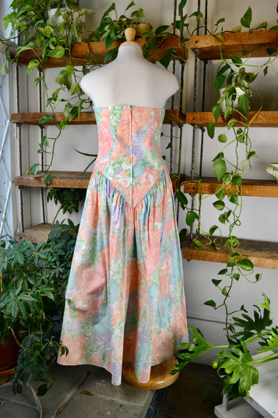 Vintage Eighties Pink Cotton Floral Matching Dress and Bolero Set. Strapless Dress, Sweetheart Neckline, Unlined, Zipper closure in Back, Basque Waist. Bolero Has Hook & Eye Closure.