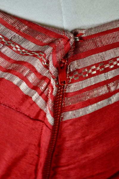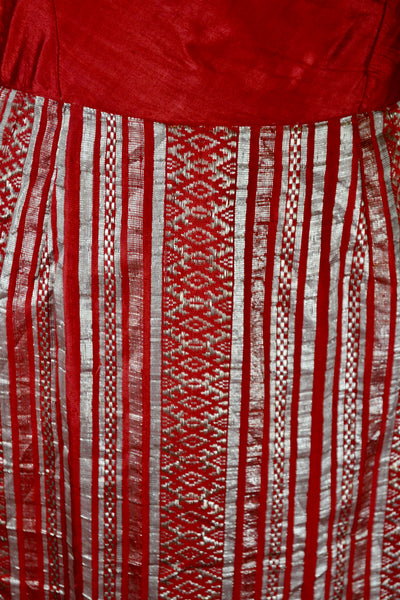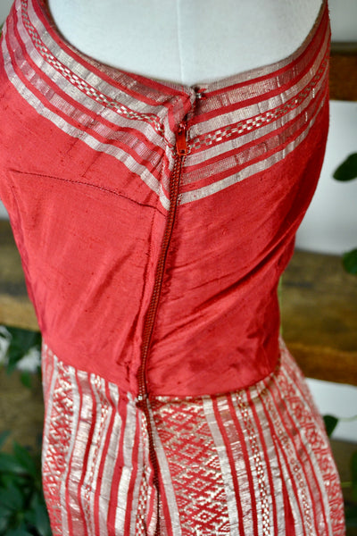 Vintage Fifties Red and Silver Metallic One Shoulder Cocktail Dress. Metal Side Zipper Closure. Unlined.
