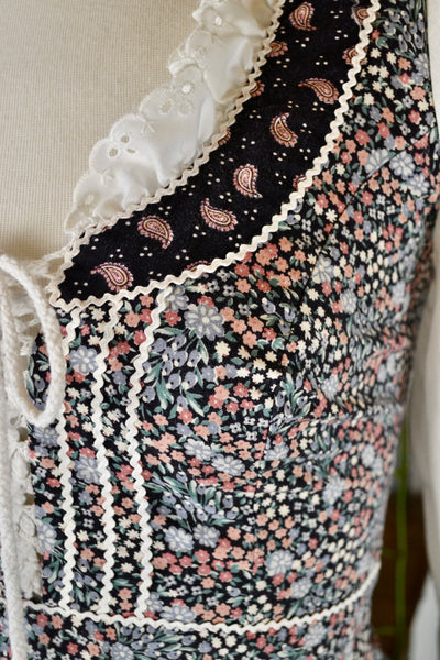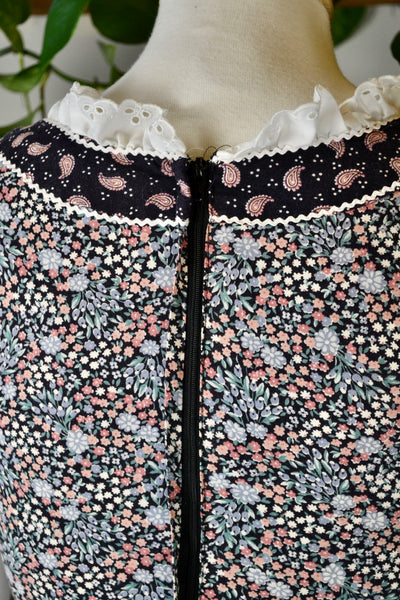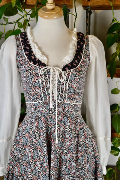 Vintage Seventies Gunne Sax Black Floral and Paisley Prairie Dress. Semi-Sheer Puff Sleeves. Unlined. Zipper Closure in Back. Two Hip Pockets.