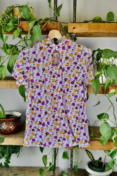 Vintage Seventies Apple Print Tee. Keyhole Neckline With Button Closure in Front. Talon Zipper Closure in Back. Unlined. Belt Loops. Band Collar.