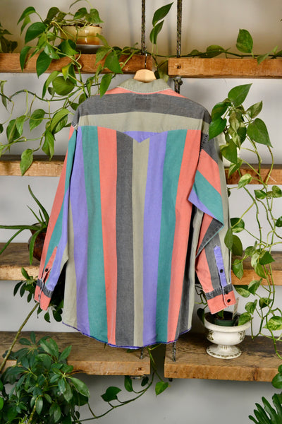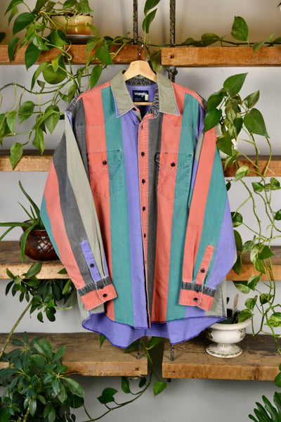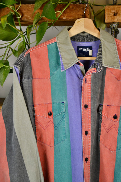Vintage Nineties Wrangler Striped Brush Popper. Button Closure. Two Chest Pockets.
