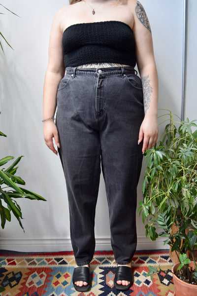 Faded Black Relaxed Fit Tapered Leg Jeans. Zipper Fly. Button Waist. Five Pockets.