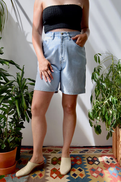 90's Light Wash Denim Shorts. High Waist. Zipper Fly. Five Pockets.