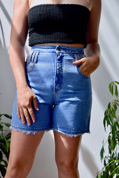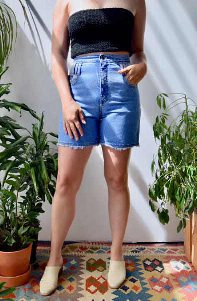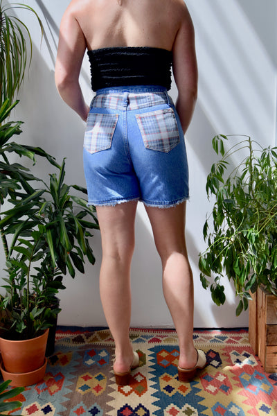 90's Blue Denim Shorts. Plaid Pocket Details. High Waist. Zipper Fly. Five Pockets. Raw Hem.