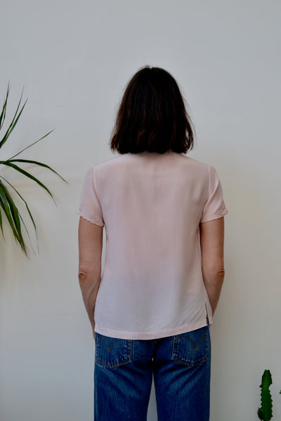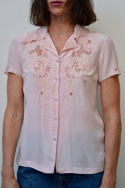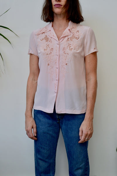 Sixties Blush Pink Blouse. Eyelet Embroidery Details. Button Closure Up Front. Notched Wing Collar. Unlined.