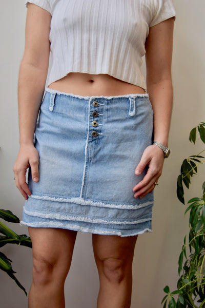 Light Wash Denim Skirt. Raw Hem and Edge Details. Button Fly. Two Patch Pockets.
