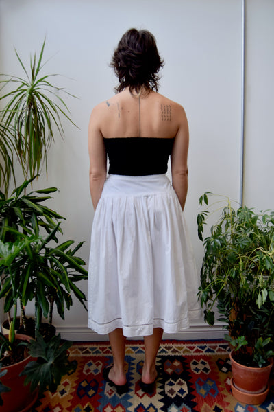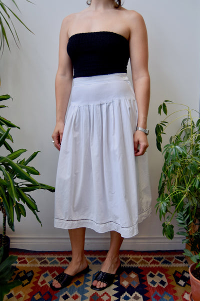 Yoke Waist White Cotton Skirt. Hip Zipper. Button Waist. Cut Out Crochet Hem Line. Unlined.