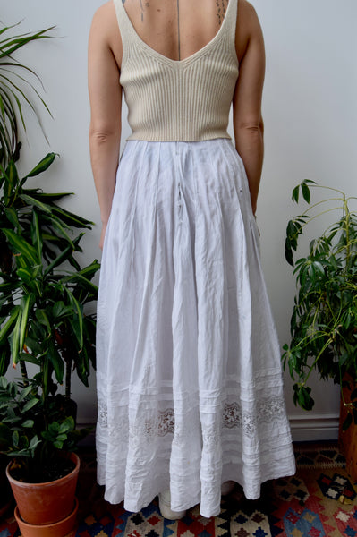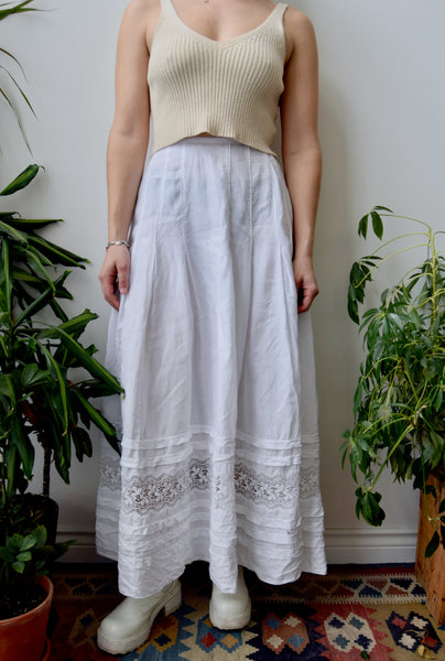 Antique White Petticoat. Feels like Linen. Lace Detailing. Hook and Eye Closure. Unlined. Heavy Fabric.