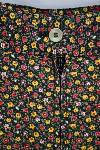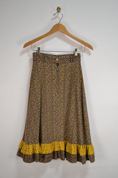 Vintage 70s/80s Black and Yellow Calico Prairie Ruffle Skirt. Two Pockets. Unlined. Talon Zipper in Back With Button Closure.