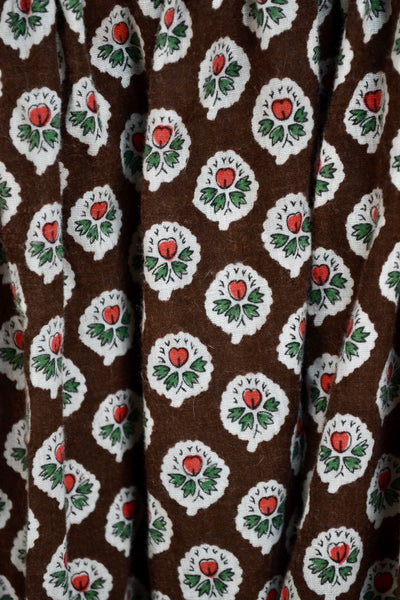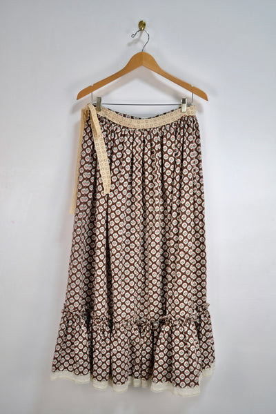 Vintage Fifties/Sixties (?) Brown Patterned Prairie Skirt. Ruffle Skirt With Lace Hem. Metal Zipper with Button Closure in Back. Lace Tie on Waist. Unlined.