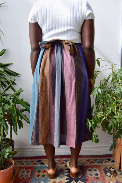Muted Grid Pattern Summer Skirt. Elasticized Waist Along Back. Waist Tie Sash. Two Hip Pockets. Unlined.