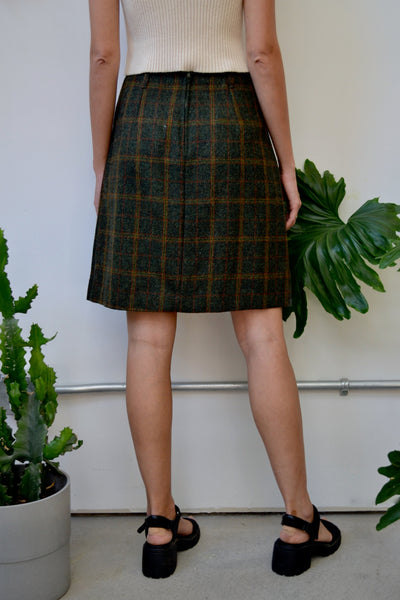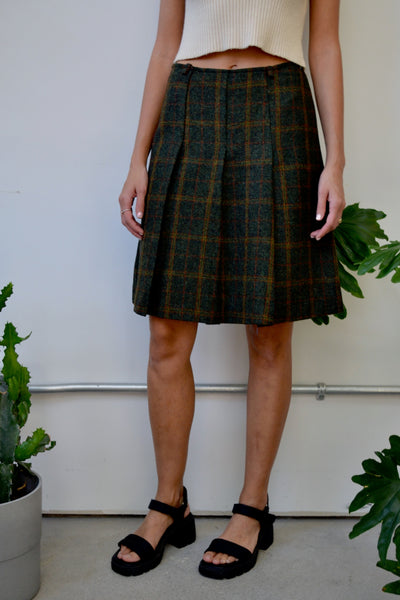 Vintage 50s/60s Dark Green And Red Wool Plaid Kilt/Skirt. Metal Zipper Closure Up Back. Hidden Button Waist Closure. Pleated Front. Partial Lining Of Upper Backside, Otherwise Unlined.