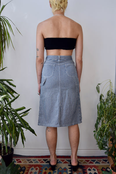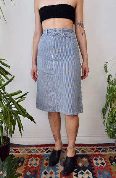 Denim Hickory Stripe Knee Length Skirt. Zipper Fly. Button Waist. Five Pockets. Hammer Loop. Unlined.
