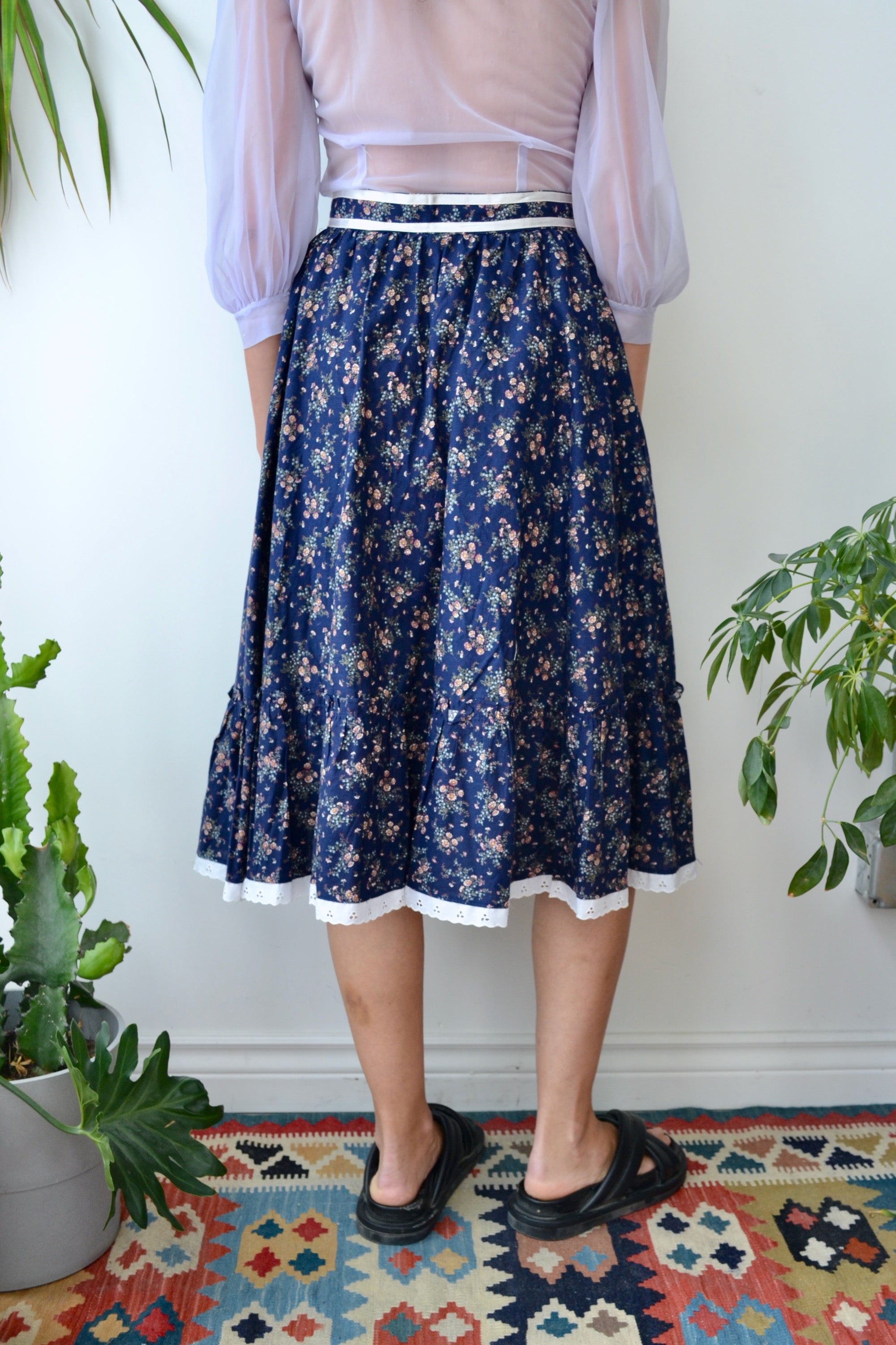 Seventies "Gunnie's" Navy Floral Prairie Skirt. Ribbon and Eyelet Lace Trim. Button Closure Up Front. Two Hip Pockets. Unlined.