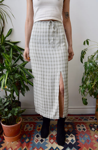 Faintest Green Plaid Skirt. Darted Waist. Side Slit. Zipper Closure. Unlined.