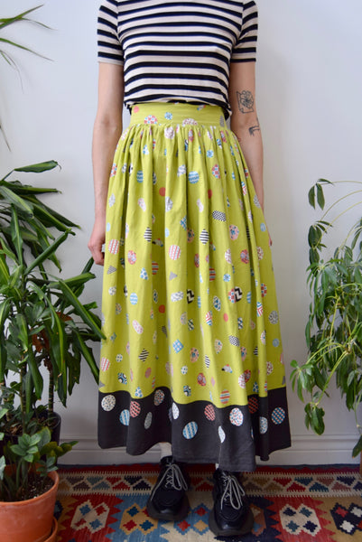 60's Lime and Black Cotton Skirt. Patterned Polka Dot Print. Unlined. Unfinished Closure Along Back.
