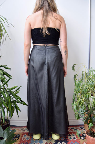 Black Silk Formal Aline Skirt. Zipper Closure Along Back Waist. Black Sheer Silk with Grey Lining.