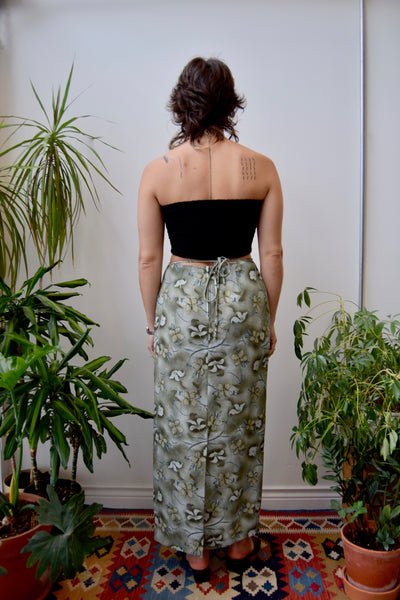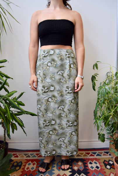 Muted Green And Blue Floral Maxi Skirt. Zipper Closure Up Back. Tie Waist Detail. Unlined.