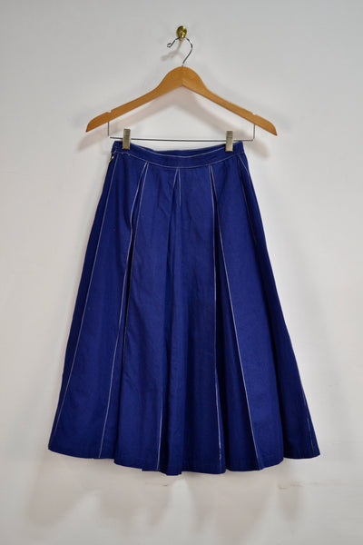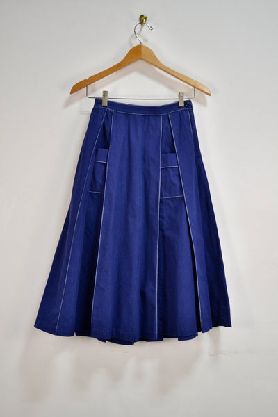Vintage Fifties/Sixties Navy Blue Pleated Cotton Midi Skirt. Two Semi-Hidden Pockets. Metal Side Zip with Button Closure. Unlined.