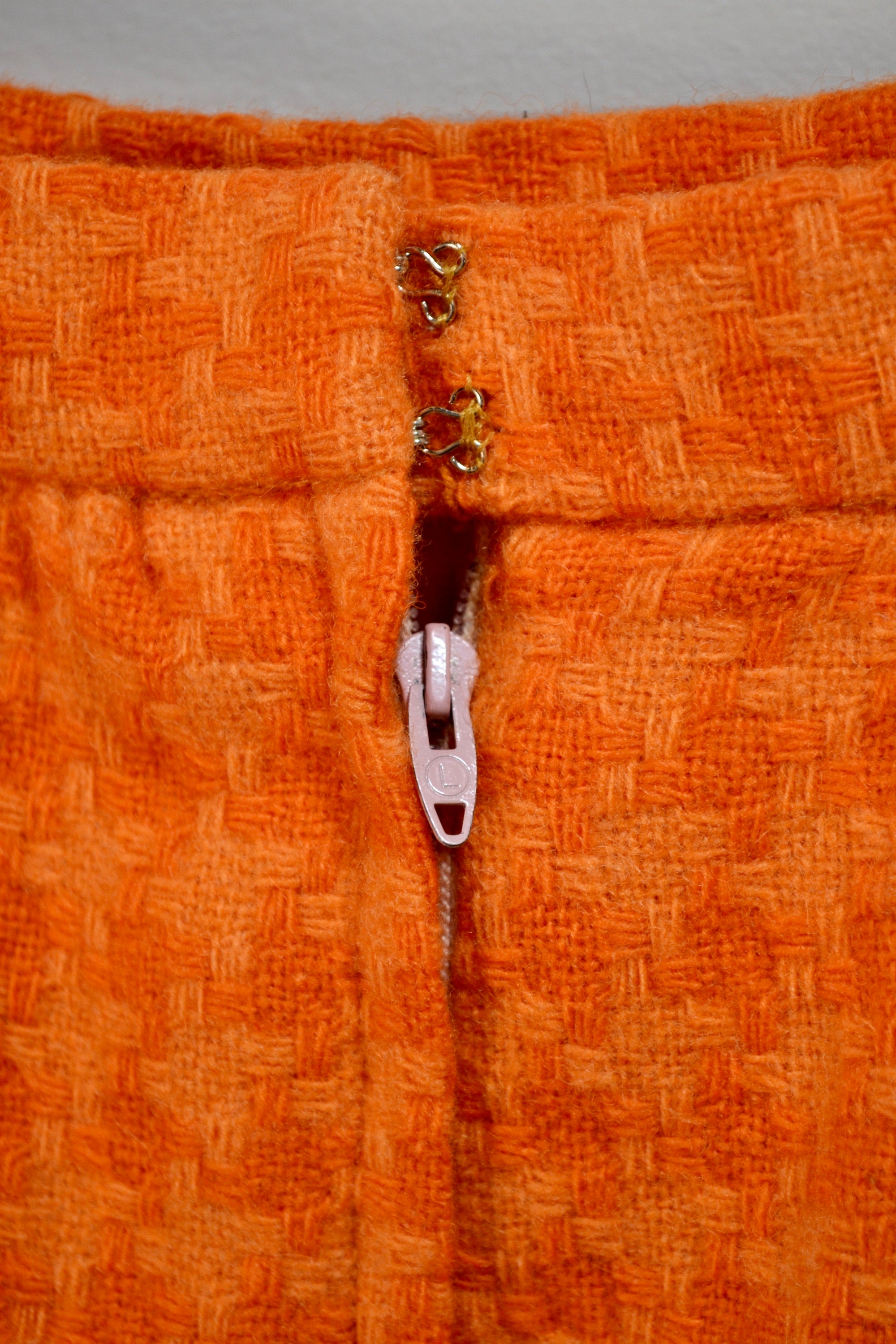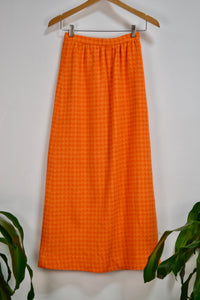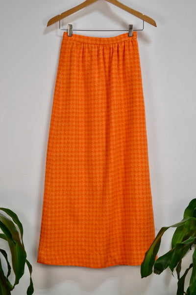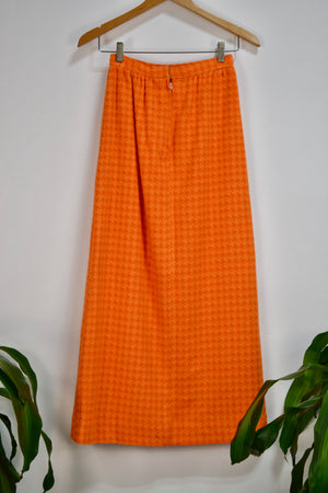 Vintage Seventies Tangerine Houndstooth Woven Maxi Skirt. Lined. Zipper in Back With Double Hook & Eye Closure.