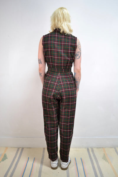Vintage Fifties/Sixties Green and Purple Plaid Jumpsuit. Classic Collar. Unlined. Tapered Leg. Sleeveless. Metal Talon Zipper Closure in Front. Pleated Details Around Waist. Two Pockets.
