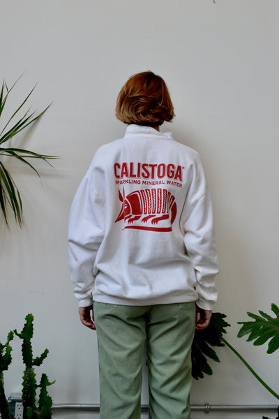 1991 "Wek The World" Calistoga Sparkling Mineral Water Pullover Sweater. Armadillo Graphic on Back. Drawstring Collar. Ribbed Cuffs, & Hem. Two Pockets.