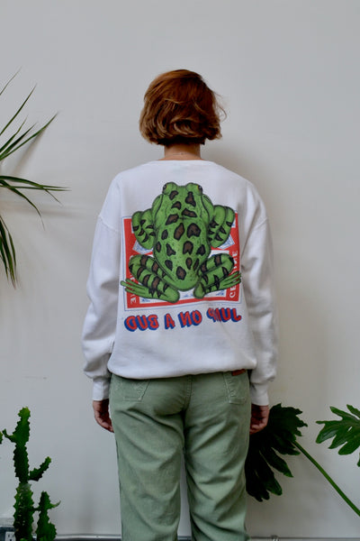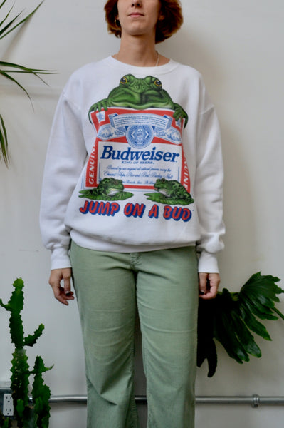 1995 "Jump On A Bud" Double Sided Budweiser Frog Crewneck Sweatshirt. Delta Label. Anheuser-Busch Inc Copyright.