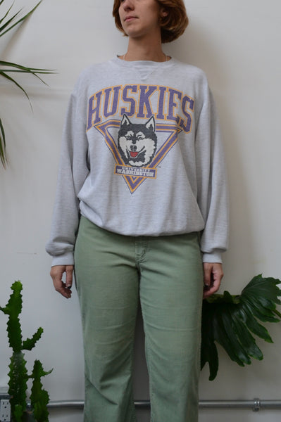 Nineties University of Washington Huskies Crewneck. Galt Sand Label. Heather Grey. V-Stitch. Ribbed Cuff, Collar, And Hems.