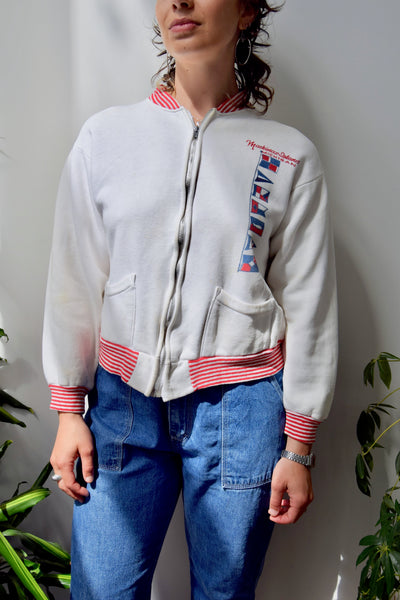 1960's "Mackinac Island Michigan" Zip Up Sweatshirt. Talon Zipper. Two Patch Pockets. Striped Ribbed Trim.