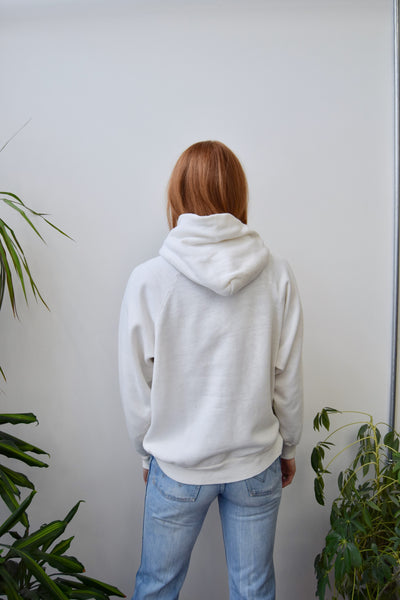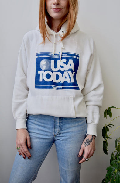70s/80s USA Today White Hoodie. Raglan Sleeve. Drawstring Hood. Bunny Hug Pocket.