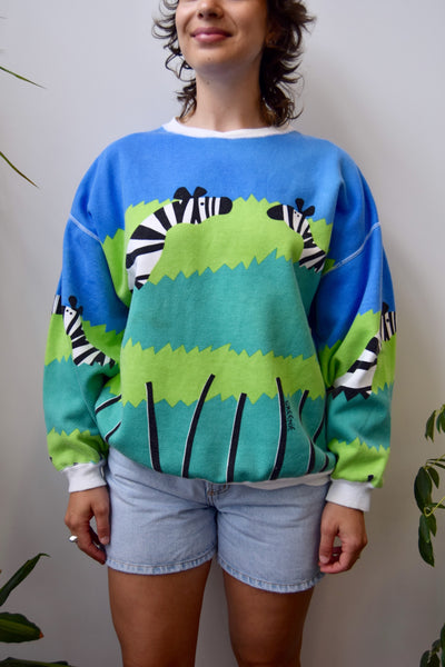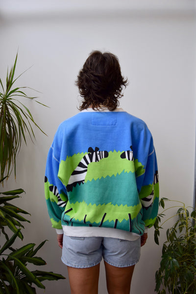 Zebras In Grass Allover Print Crew Neck Sweatshirt. Waffle Knit Collar And Cuffs. Unlined.